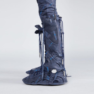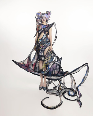 Xijia’s latest collection was inspired by the first and largest platform for anime/manga-inspired fashion: @animefashion.archives, which she established in 2020. The collection has zero-waste knitwear garments made with upcycled yarns, accessories, footwear, and garments, using up-cycled materials, gallery posters, electronic trash, and broken anime figures from toy factories combined with 3d pattern-making and placement prints.
