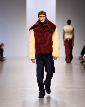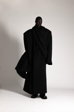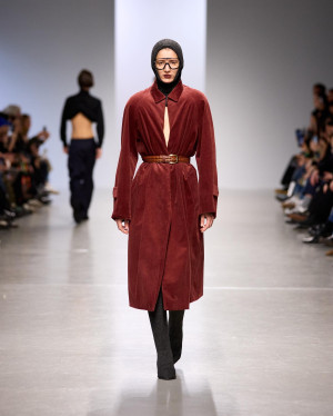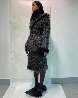 Qianhanliu studied womenswear at Central Saint Martins for her BA and has recently graduated from IFM with an MA in February. Her latest collection is about healing—a journey of understanding. It embodies a philosophy of peace, sobriety, and equality. A utopian lifestyle. A yearning for wellness. The collection draws parallels between two unreachable, overmarketed nirvanas of stereotypical Eastern oneness: the generous tailoring of one-piece cuts, easy jersey, and chunky knitwear of East Coast preppy style, and the drapery of natural textures from East Asian temple traditions. T-shirts and coats twist like knotted robes, recycled leather is printed and treated to resemble aged wood, and thousands of fallen leaves—each laser-cut from leather offcuts, singed, and stitched by hand—envelop an oversized sweater.