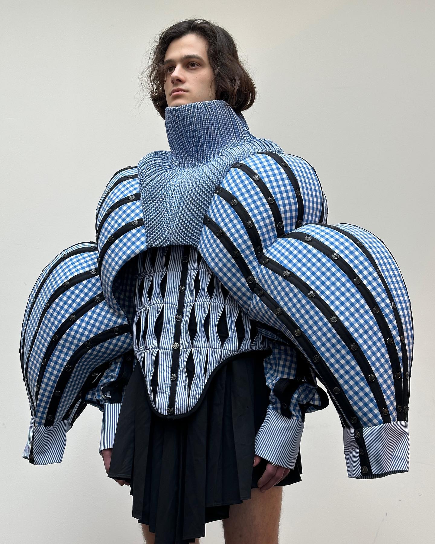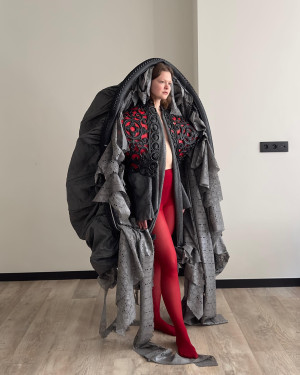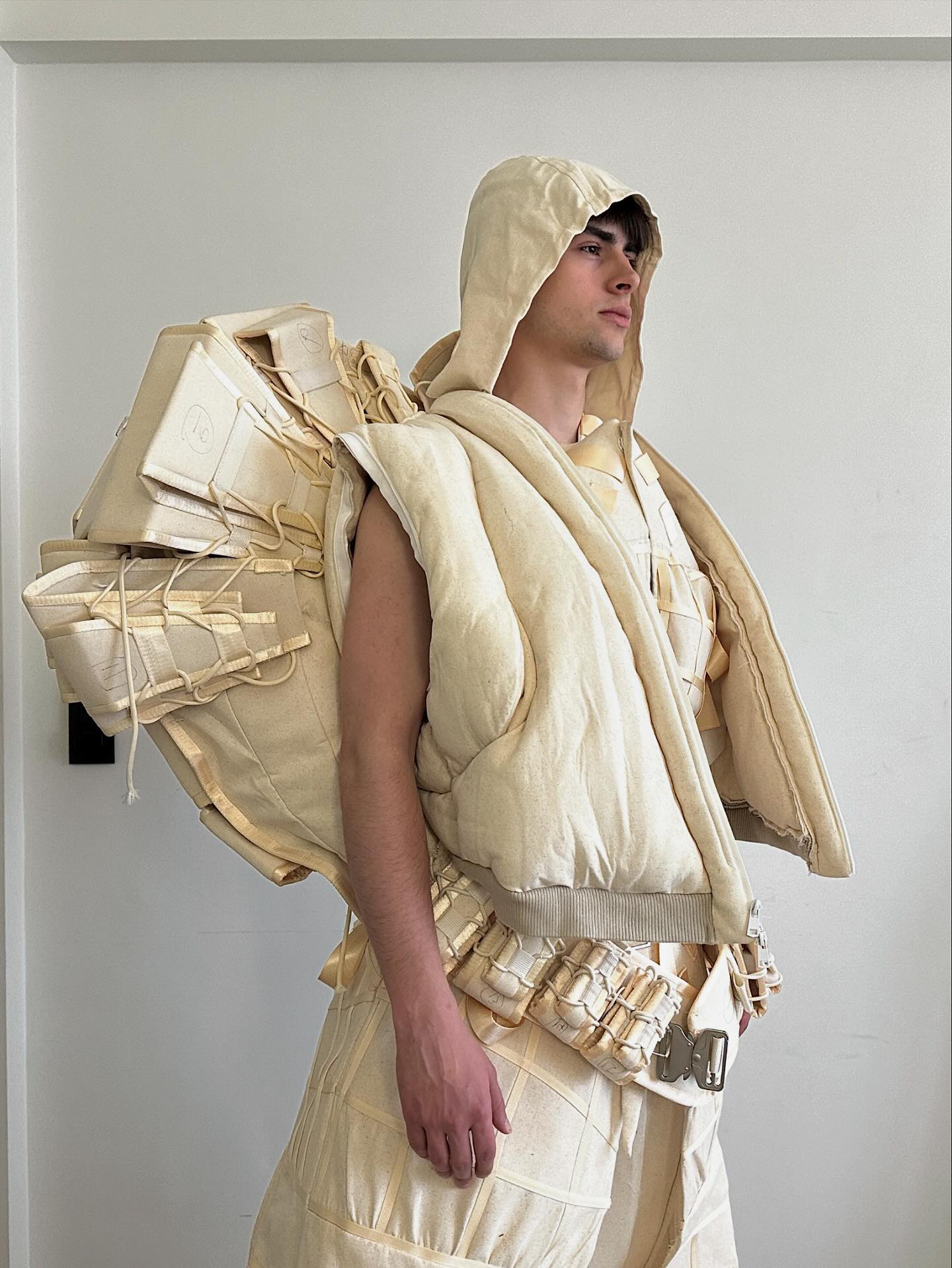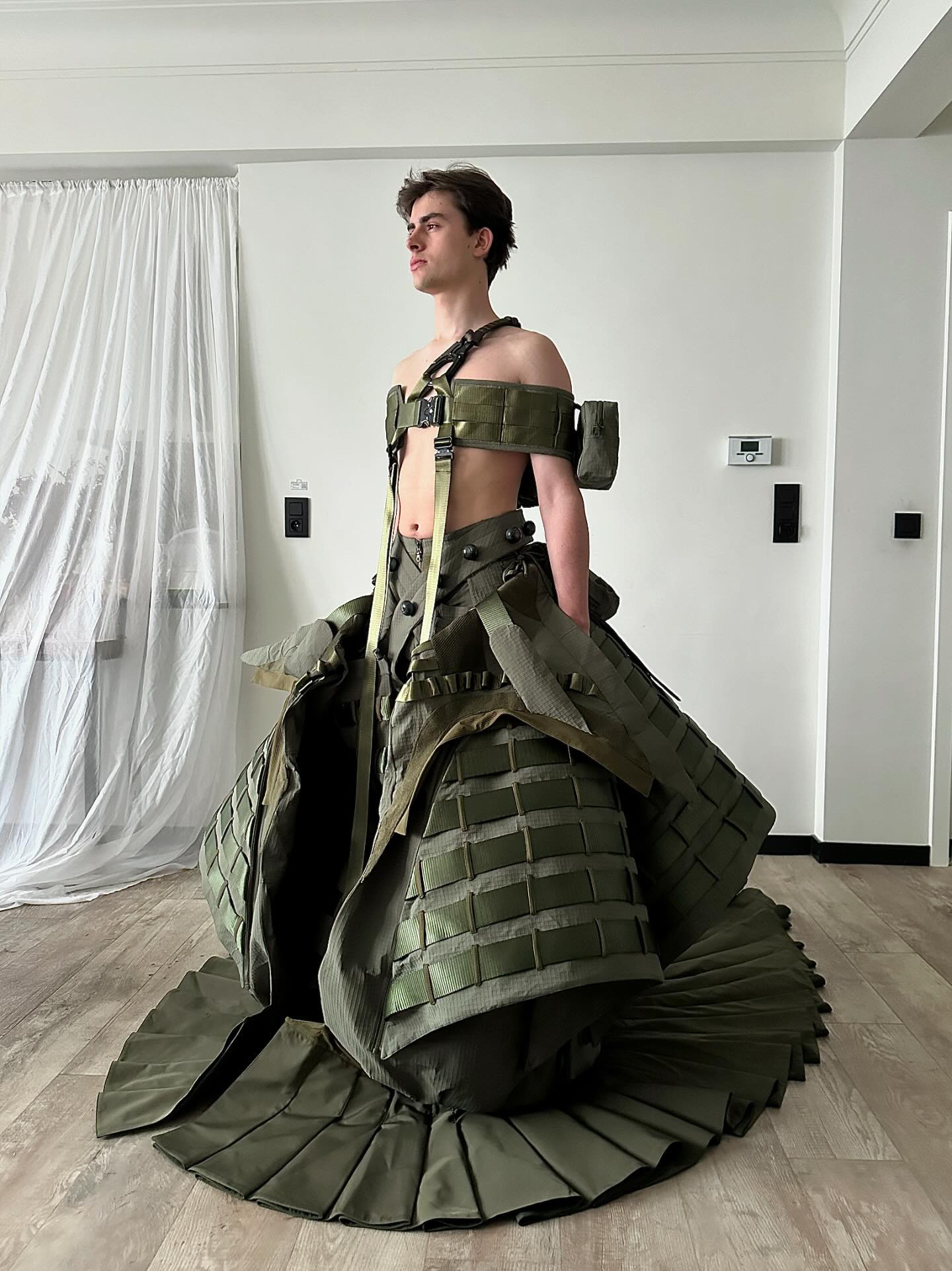 AoJiErOu, a student at the Royal Academy of Fine Arts Antwerp, uses fashion as a tool to challenge conventions and address complex social issues. His latest collection focuses on a chilling idea: the enduring influence of war on humanity.