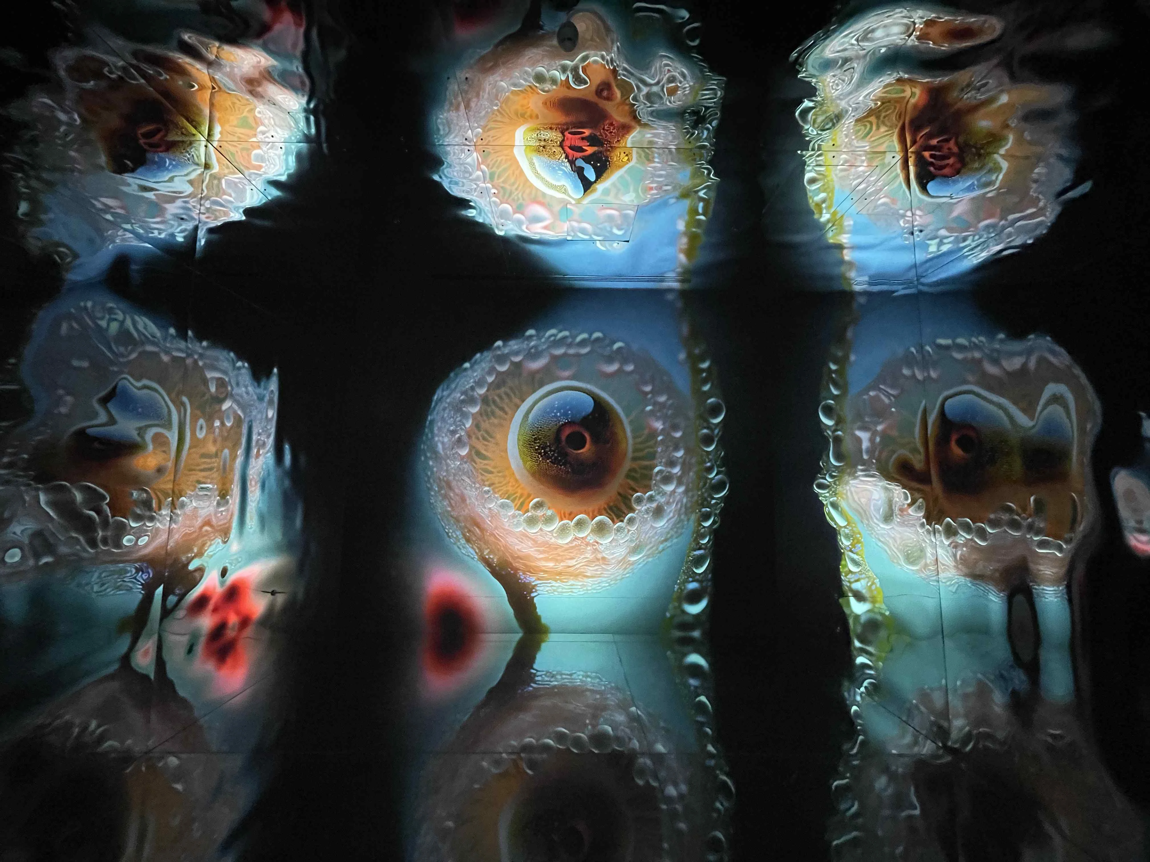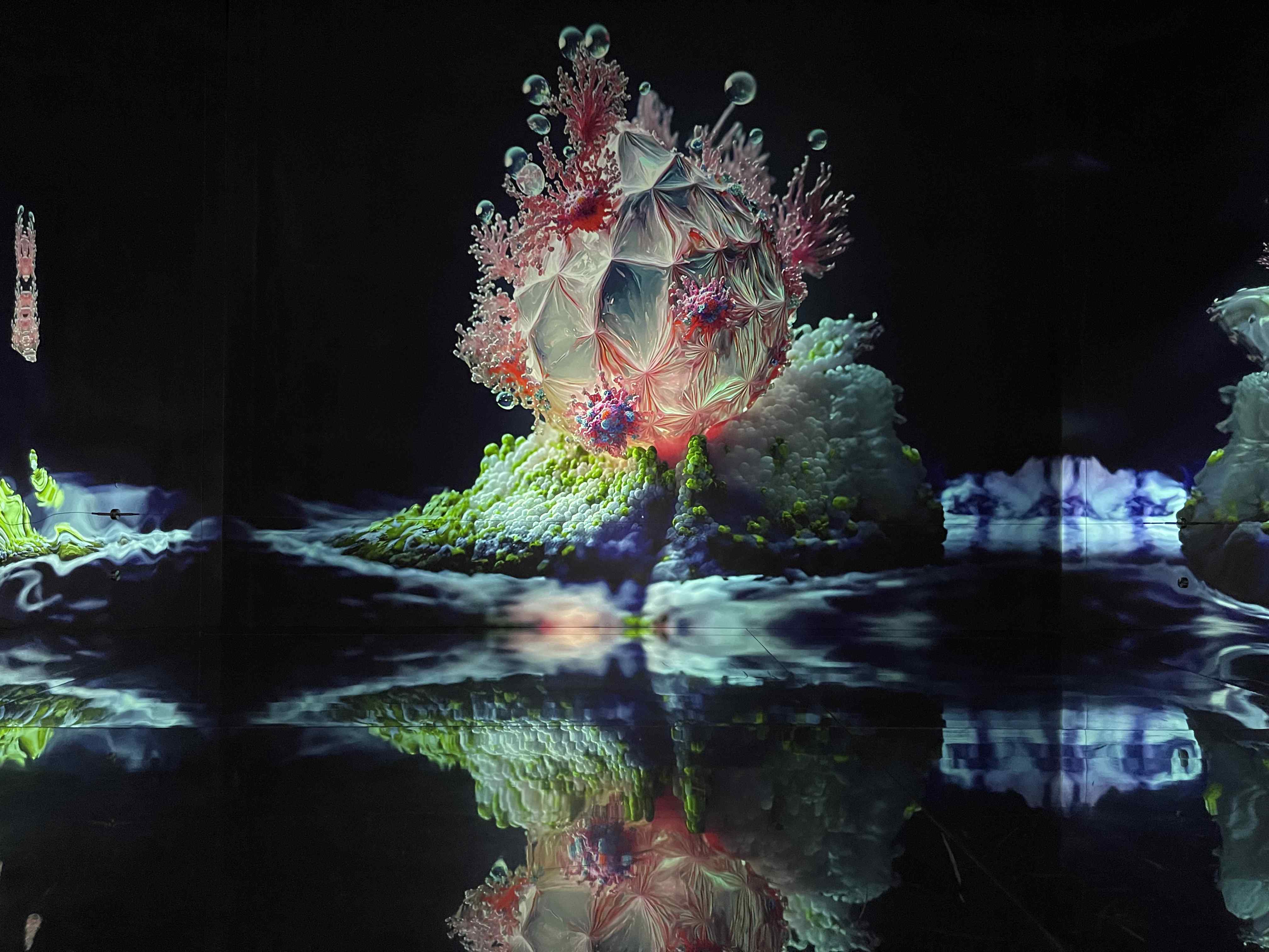 The adventure began as we crossed the threshold into 'Formation Space.' Here, Kay’s masterful artworks, born from two decades of exploration, unraveled the origins of life itself. Through mesmerizing visuals, we journeyed through the inception of organic molecules, witnessing the evolution of life from the unique vantage point of artificial intelligence. Mirrors, reflecting endlessly, drew us into a captivating tale of emergence and supervenience, blurring the lines between reality and imagination.
