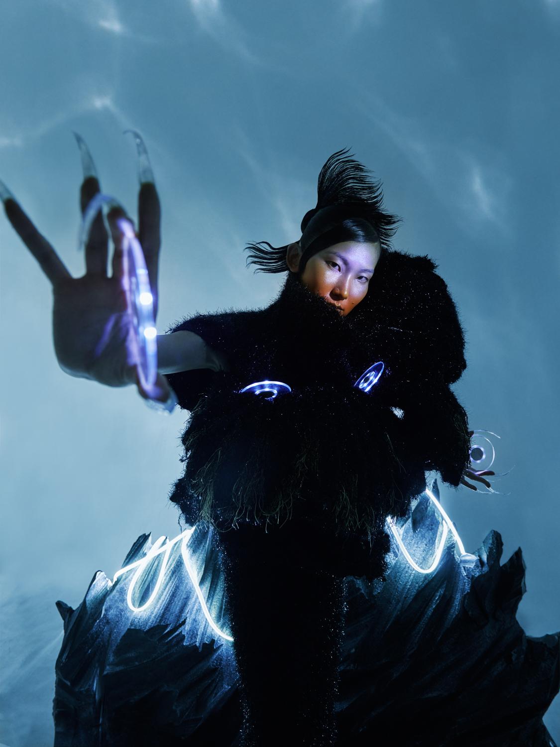 For World 2.0, I merged both of these techniques. While working with the real set made of lighting snakes & apocalyptic rocks from the set designer Effie Gu, I also collaborated with 3D artists Zixuan Zhang and Nina Doll to enhance some of the photographs with the futuristic 3D elements. The whole series