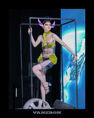 VANEBON, her eponymous label, is inspired by the figure of the retro-futurist heroines to create a wardrobe befitting the female of the future. Ultra-feminine silhouettes converge with sharp panelling, volume with structure, luxurious embellishments with bi-tech materials to create a fusion of glamour and sportswear.
