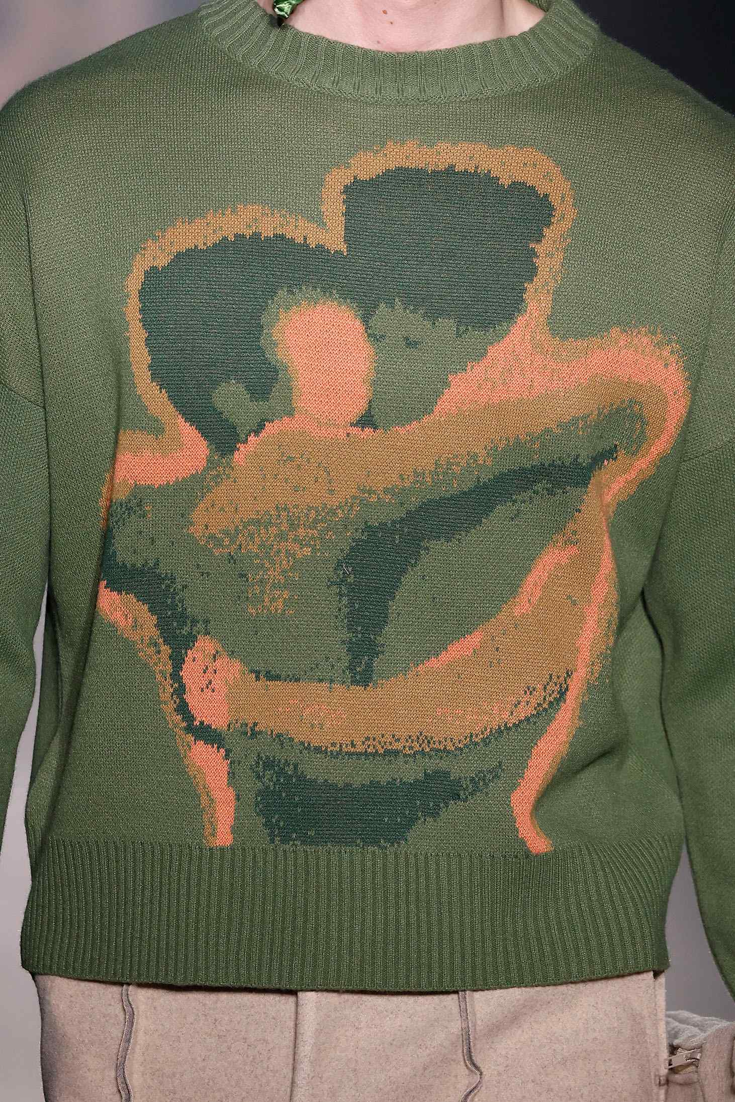 Central to our concept is the eternal nature of the point, celebrated through the infinite fragments reminiscent of the enigmatic number pi. This fusion of art and fashion is exemplified through visuals transformed into jacquard sweaters, each thread meticulously interwoven to create a tactile and visual composition that resonates with thought-provoking elegance. We took cues from Tokyo's busy metro scene and used scanning and 3D printing to capture the sensation of being surrounded by a sea of faces. The flattened faces in our designs represent the complexities of crowded cities and the diversity of people within them.