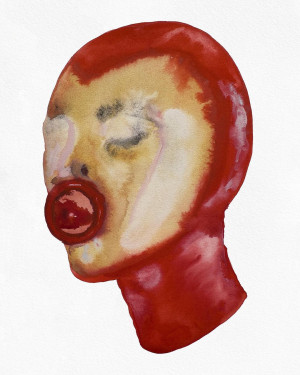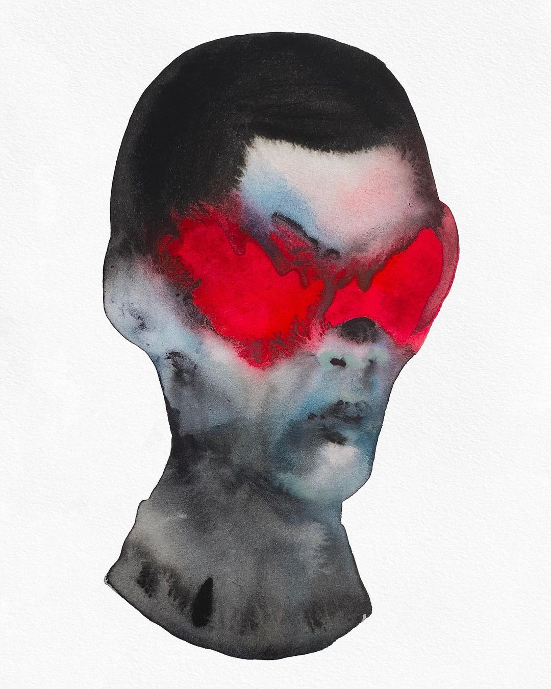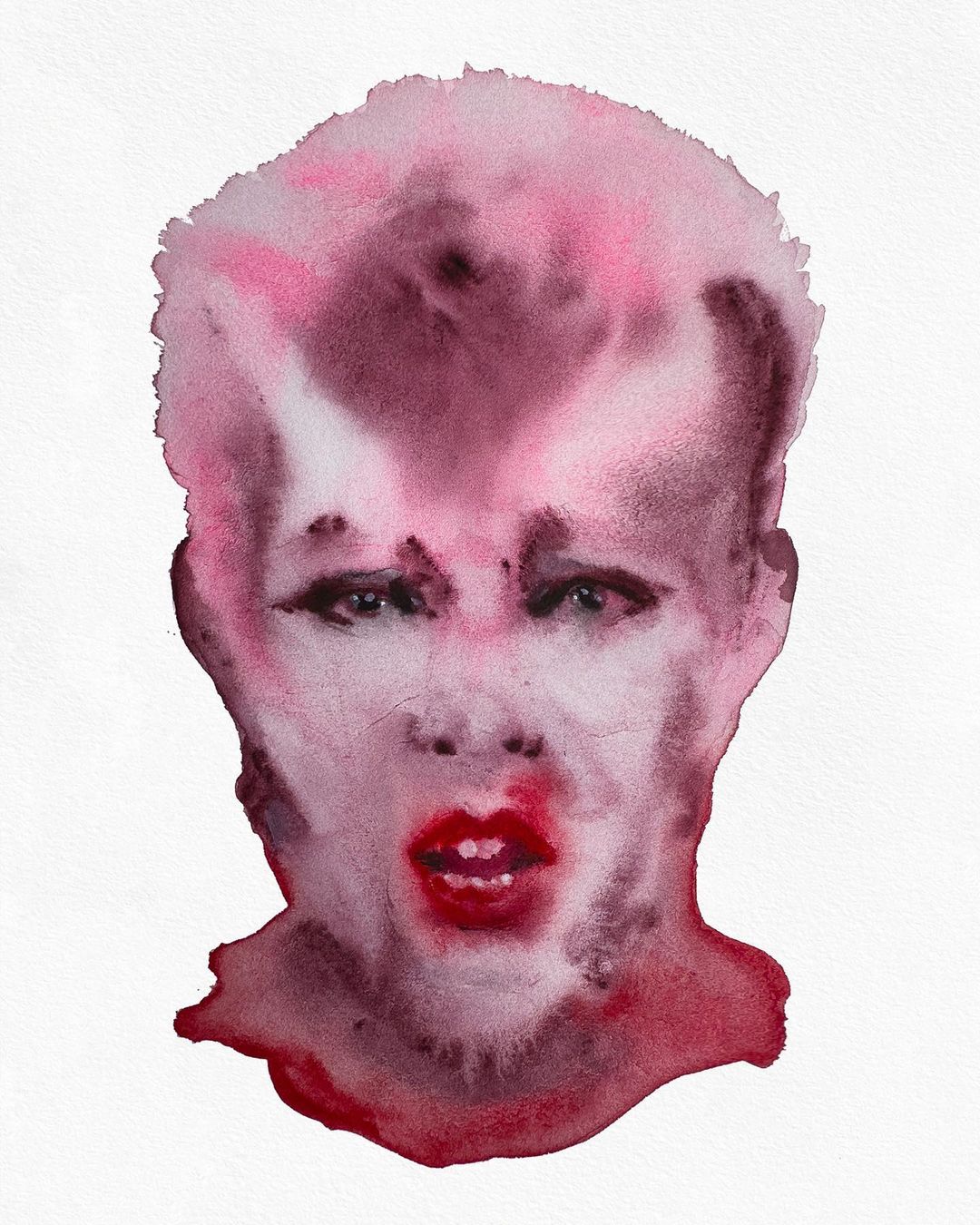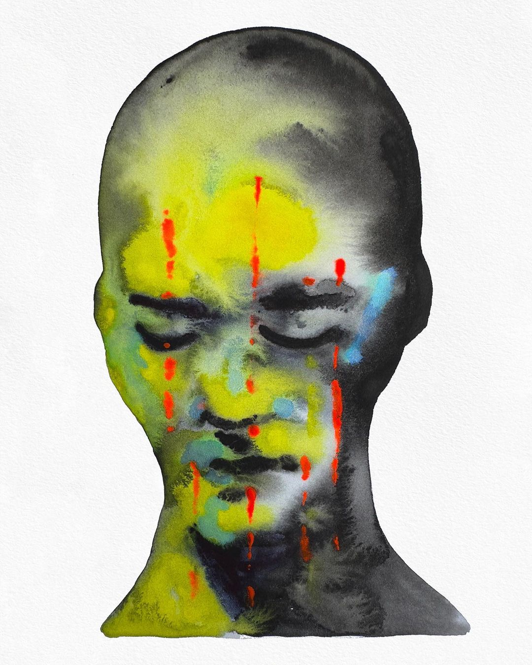 The heads began to appear subconsciously and I found I was still able to imbue a certain amount of abstraction into the textures and colors using the wet-on-wet watercolor technique. On the verge of abstraction is a good way of putting it. The whole process of working wet on wet with watercolor is quite risky and a lot is left to chance. I am interested in how the materials and process affect the outcome. I don’t want to see too much of my hand in the work. The most successful works for me are ones that feel like pools of color have converged by chance to form an eye or mouth or the entire head.