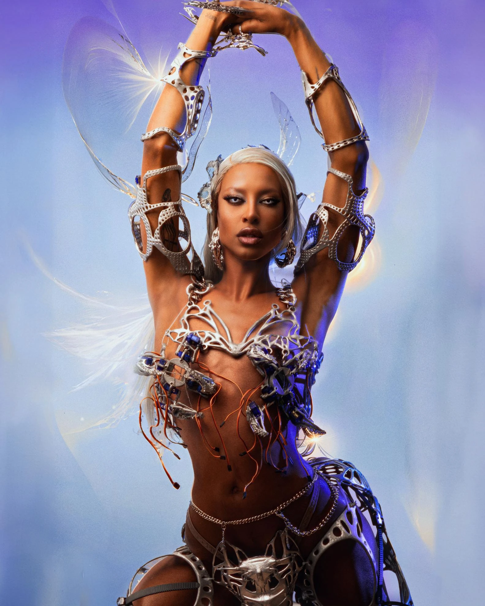 At its heart lies Sapiensi's robotic couture, a marvel of modern design and technological prowess. By uniting advanced robotics with avant-garde fashion sensibilities, the collaboration heralds a new era where style and innovation converge effortlessly. Tayce embodies the Oracle, a symbol of wisdom navigating through the labyrinth of existence, adorned in metallic bodysuits and 3D printed accessories that serve as both protection and artistic expression.