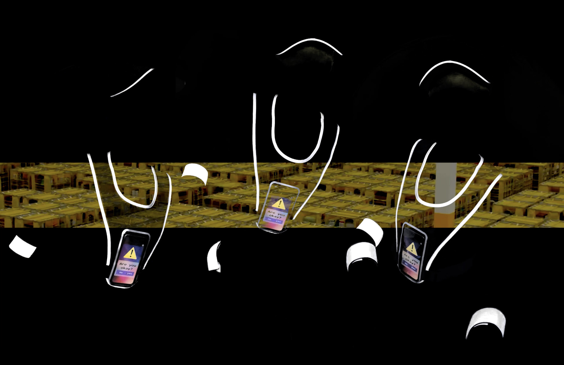 Instead, talking about the future, I would like to speak about Never Let Them Know Your Next Move (2022), in this work you extrapolate existing worries about the gig economy and surveillance capitalism into a hypothetical employment and governance system that commodifies human motion and that could eventually replace human language. Even though all of it is fictitious, it does seem extremely real, something that could happen in the very near future. Therefore I wanted to ask you where the inspiration for this work came from and how did you come up with the “rebellion” tactics that your characters use to confuse but also empathize with the machines? Any real-life events that you might have seen happening somewhere around the world?