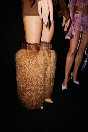 The Fall Winter 2024 collection is no exception. Domingo's approach is eclectic and richly detailed, using best-selling silhouettes of the house and infusing them with marine elements like lace, denim, recycled leather, and fur, alongside rivets and metallic pieces. This collection is framed within the balletcore aesthetic, which is celebrated for its elegance and expressive freedom. In terms of color, the collection features a palette of classic pastels, punctuated by the boldness of lime green, oxygenated denim, and rich browns, all intricately detailed with rhinestone inlays.