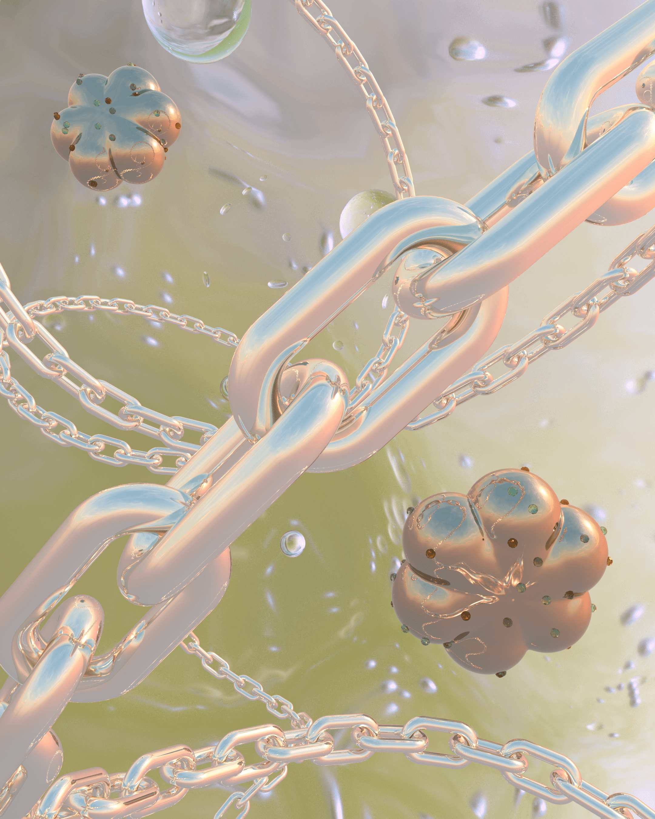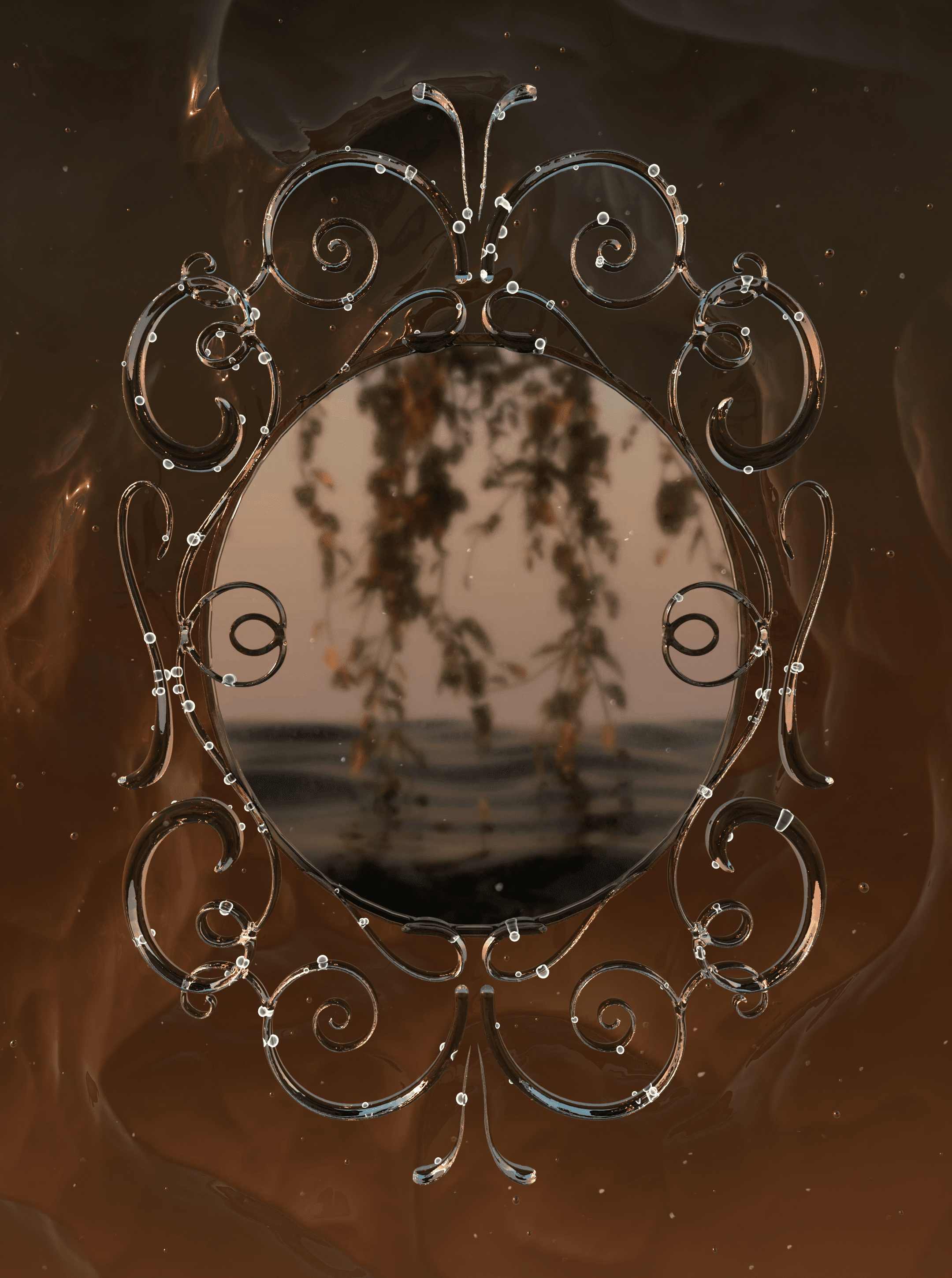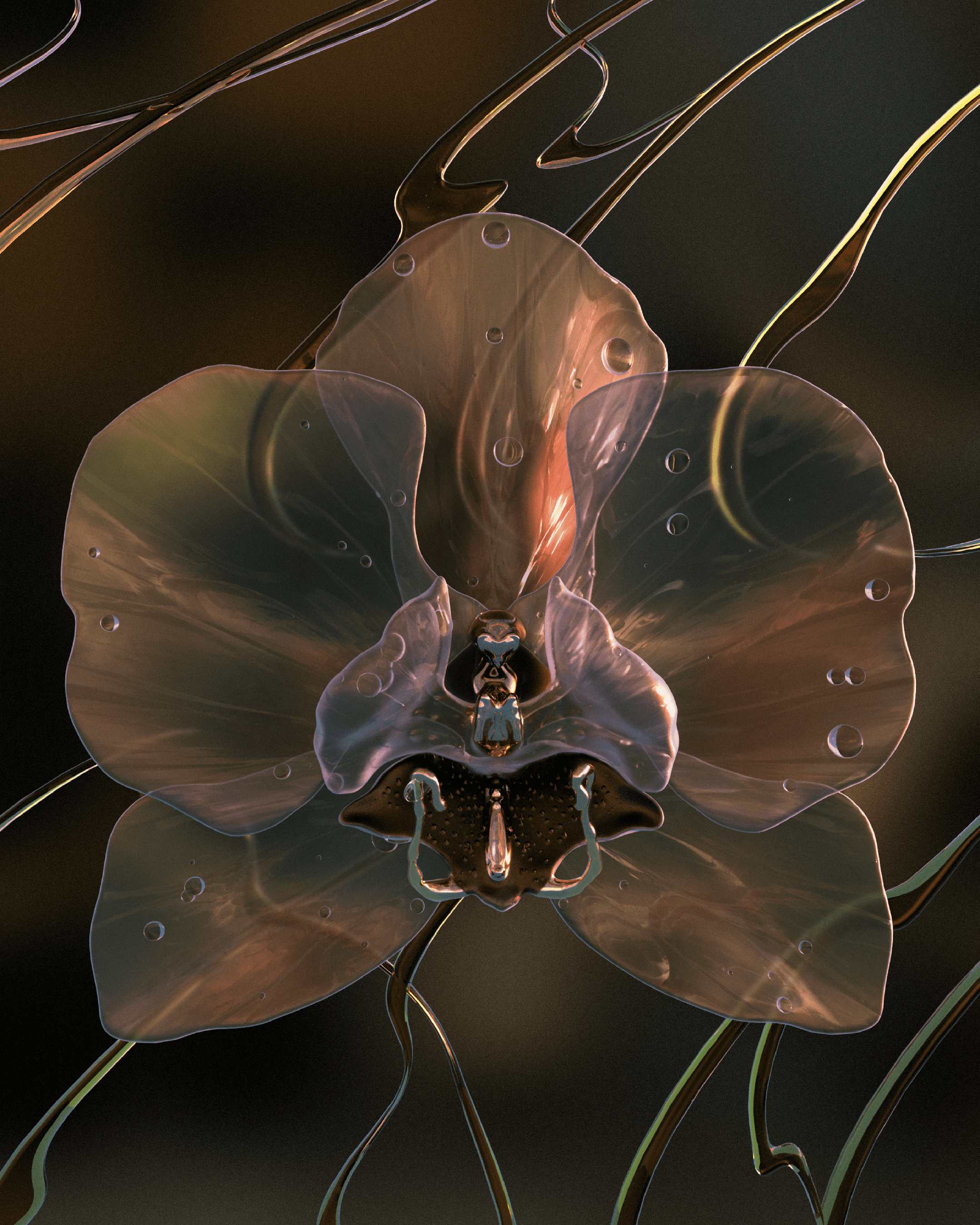 My designs are very informed by my lived experiences as a chronically ill artist. In many ways, I consider 3D software to be a portal that allows me to build fantastical dreamscapes where my mind can freely roam when my body physically cannot. In this vein, much of my work is lit to simulate twilight—the liminal window of time where two states of existence meet. Similarly, the materials I most frequently use—like glass—have innately fragile attributes but are imbued with strength when molded into sinewy, organic forms.