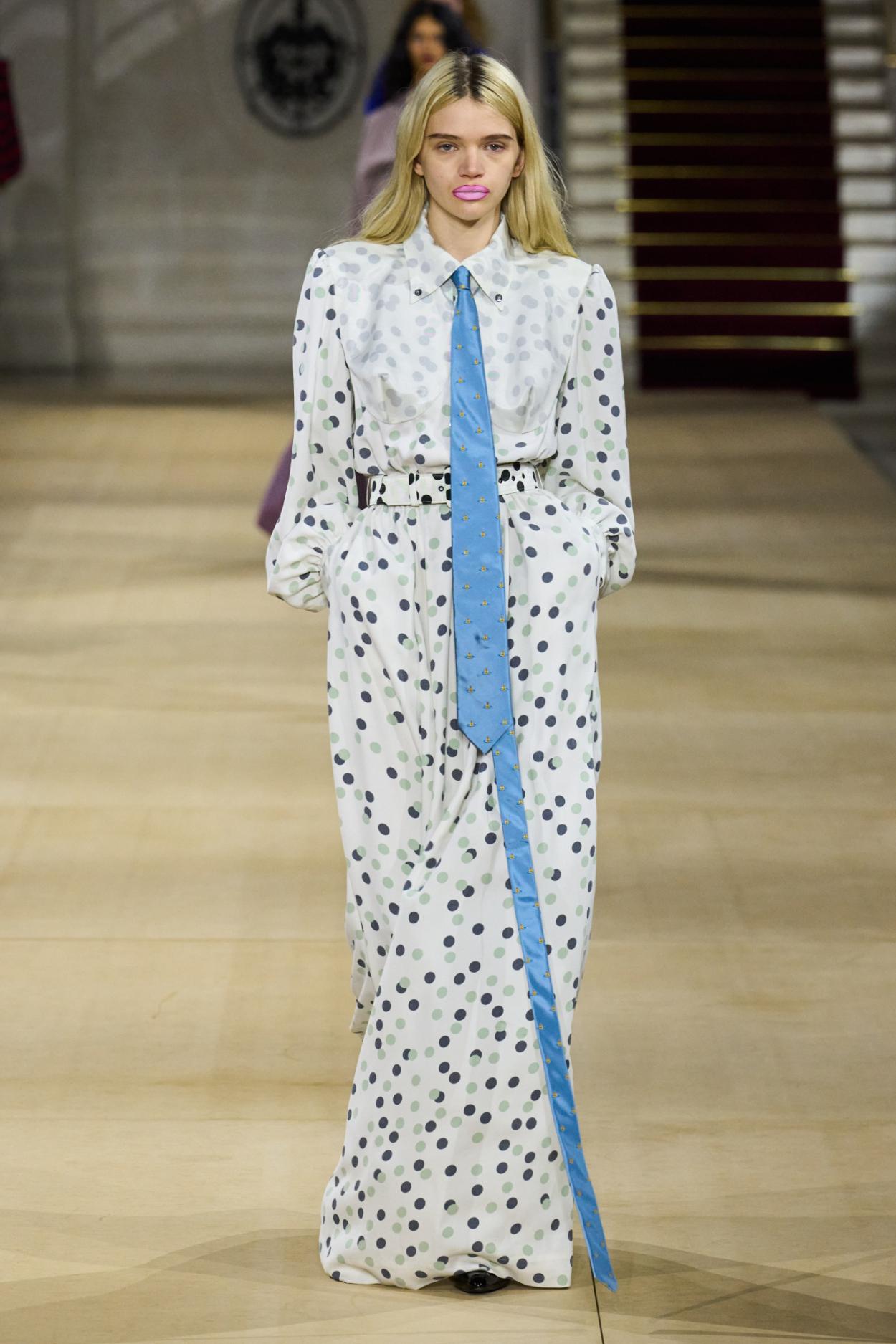 Andreas Kronthaler’s Fall-Winter 2025 collection for Vivienne Westwood presented a daring, genderless narrative that broke traditional archetypes. The runway showcased a blend of feminine and masculine styles, with female models wearing tailored, masculine designs alongside more feminine and sensual gowns, while male models embraced traditionally feminine looks. The collection featured long ties hanging down to the knees, voluminous long garments, wide-shouldered coats and blazers, and high, stacked hats typical of Englishmen. It also showcased a mix of patterns, including stripes, polka dots, and checks, highlighting Westwood’s iconic eclectic style. Kronthaler's collection celebrated a fluid approach to fashion, honoring Westwood’s legacy while pushing the boundaries of gender and style.