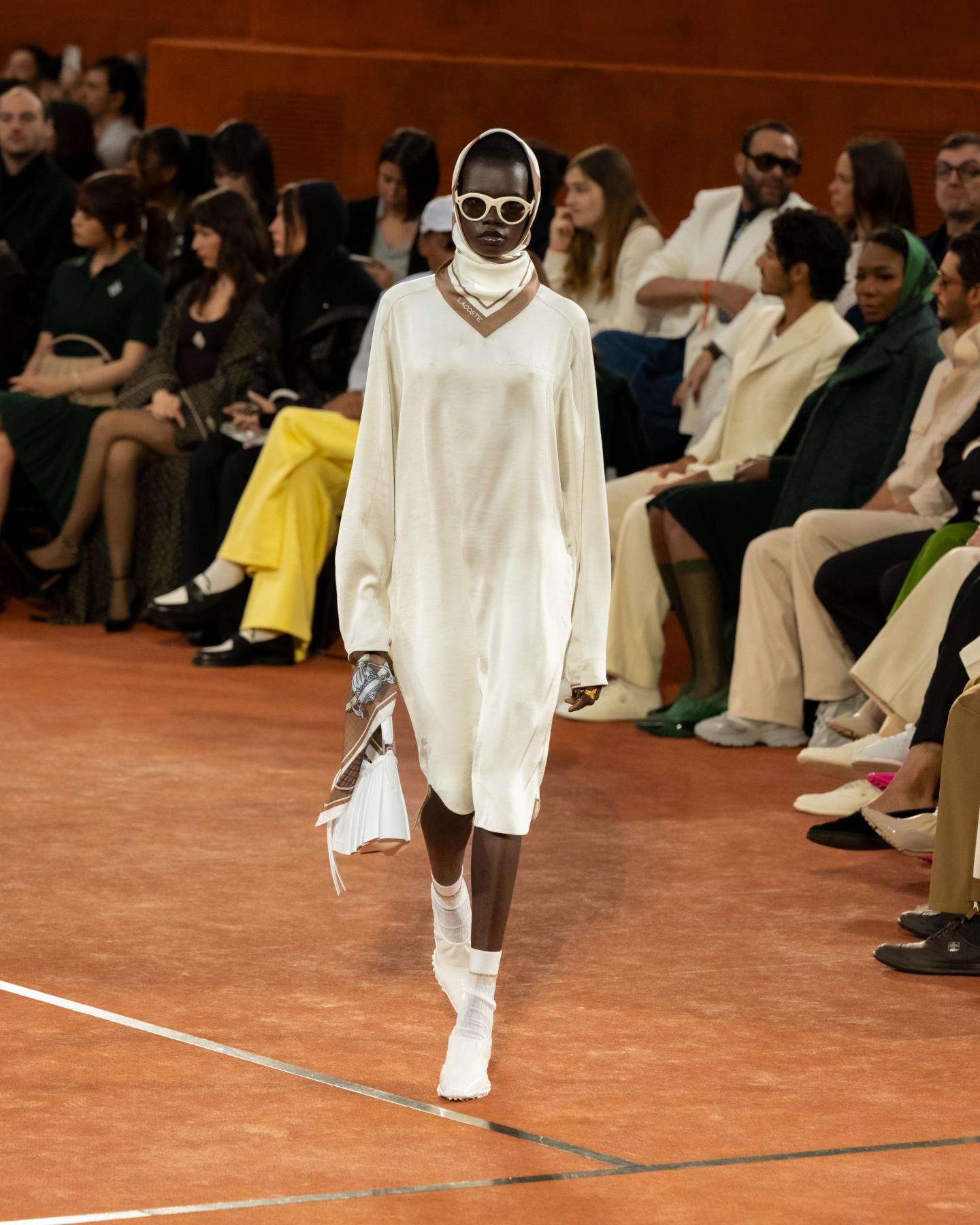 Pleated skirts, luxurious blazers, and technical trenches brought sophistication to the sporty aesthetic. The iconic Lacoste polo was reimagined as longer dresses, while the crocodile motif appeared as both an accessory and a print, reinforcing the brand's legacy. A mix of neutral tones and vibrant hues created a balanced palette, highlighting the seamless blend of athleticism and luxury. The collection was a tribute to Lacoste’s enduring spirit, merging classic sport with contemporary style in a way that felt both refined and dynamic.