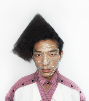 Of all the hairstylists showcased today, Yuho Kamo is the most singular one. Often involved in digital-focused projects, Yuho’s hairstyling is a way to deviate, distort and disrupt beauty standards that still dominate across all platforms. In what, in this sense, can be called an anti-hegemonic creative enterprise, punk and grotesque are great influences both as a general attitude and in the looks created. Taking inspiration from horror and thriller movies, Yuho Kamo is not afraid to deal with “bad taste” by mixing it with counter-cultural references: in his debut zine HAIRMASTER, distorted portraits and disturbing CGI enhance the anti-beauty stance of the author who is committed to only using synthetic hair as an antidote to the constraining standards of the contemporary fashion landscape.