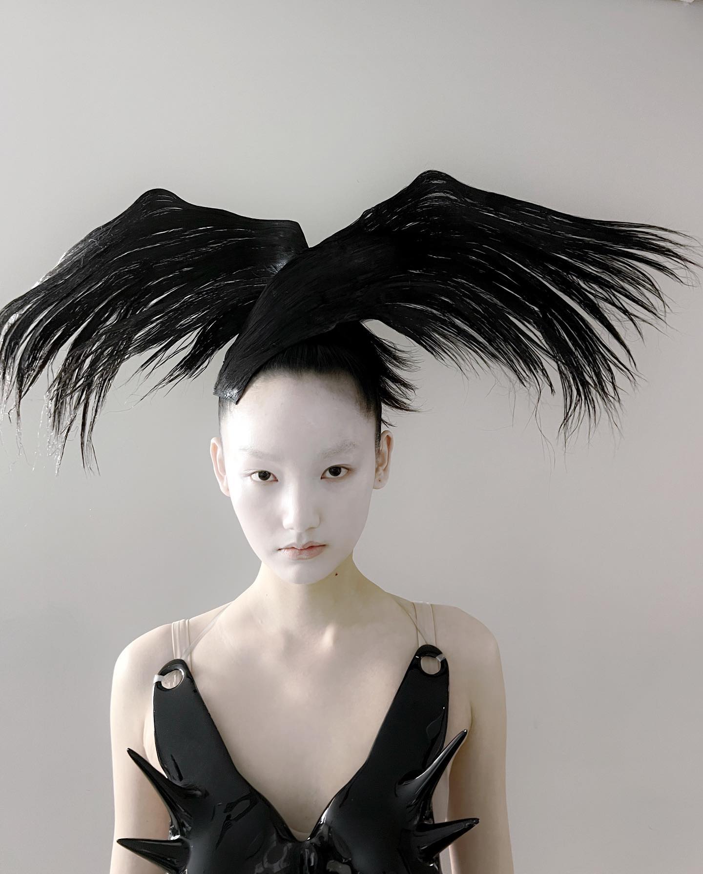 Known for a prolific imagination culminating in creations that are at the same time geometric and surreal, Eda Lee is a makeup artist, hairdresser and art director based between Shanghai and Guangzhou. With an endless list of editorials and collaborations under the belt, Eda is one of the leading creators in today’s fashion scene. Originally reinterpreting styles coming from youth subcultures and inspired by videogames and surreal imagery, Eda Lee has recently started co-creating with AI in a series of mind-bending portraits showcasing gravity-defying hairstyles that remind us of the almost endless possibilities opened up by the digital world. Lee shows how in the near future the physical and the digital will not only interact but will be fully integrated.