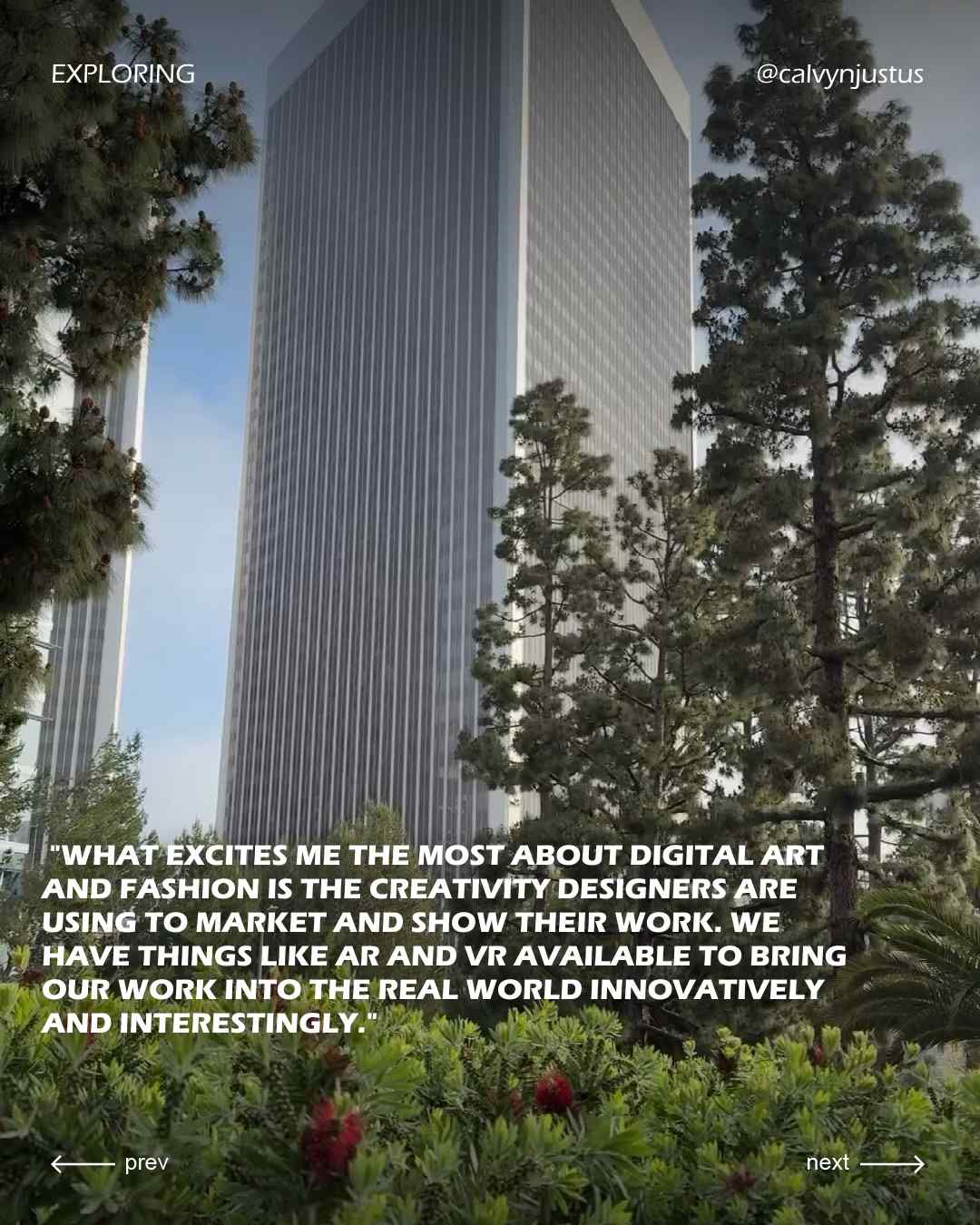 "What excites me the most about digital art and fashion during 2024 and beyond is the creativity designers are using to market and show their work. We have things like AR and VR available to bring our work into the real world innovatively and interestingly."