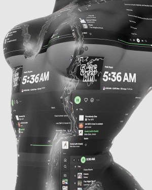 In the series of works featuring interfaces from Pornhub, I superficially explore the relationship between ourselves, our sexuality, and the digital realm. And when I say SUPERFICIAL, I mean it quite literally because our way of relating is superficial, sterile, and consumed quickly. That's why these interfaces scroll over the surface of bodies, as if reflecting upon them. I have a special fondness for these works because, for me, they directly touch upon our desires, secrets, and hidden pleasures. They appeal to our intimate and private selves. I like to think of them as a digital aphrodisiac. They engage the viewer, as anyone can feel identified with them. They point at you and say, "If you recognize this interface, it's because you've seen yourself consuming its content, and you probably enjoy it." Many people are impacted by them; they are drawn to them, feeling that magnetism and touching upon memories of pleasurable moments. Ironically, they make others uncomfortable, ashamed even. They touch upon very human emotions. When I started this series, it was serendipitous, during the COVID pandemic. I began experimenting by overlaying textures from streaming companies onto these 3D models. Suddenly, I saw that they deliver what they promise: they represent, in a simple, fast, and unfiltered way, how we relate in the digital world: quick consumption.