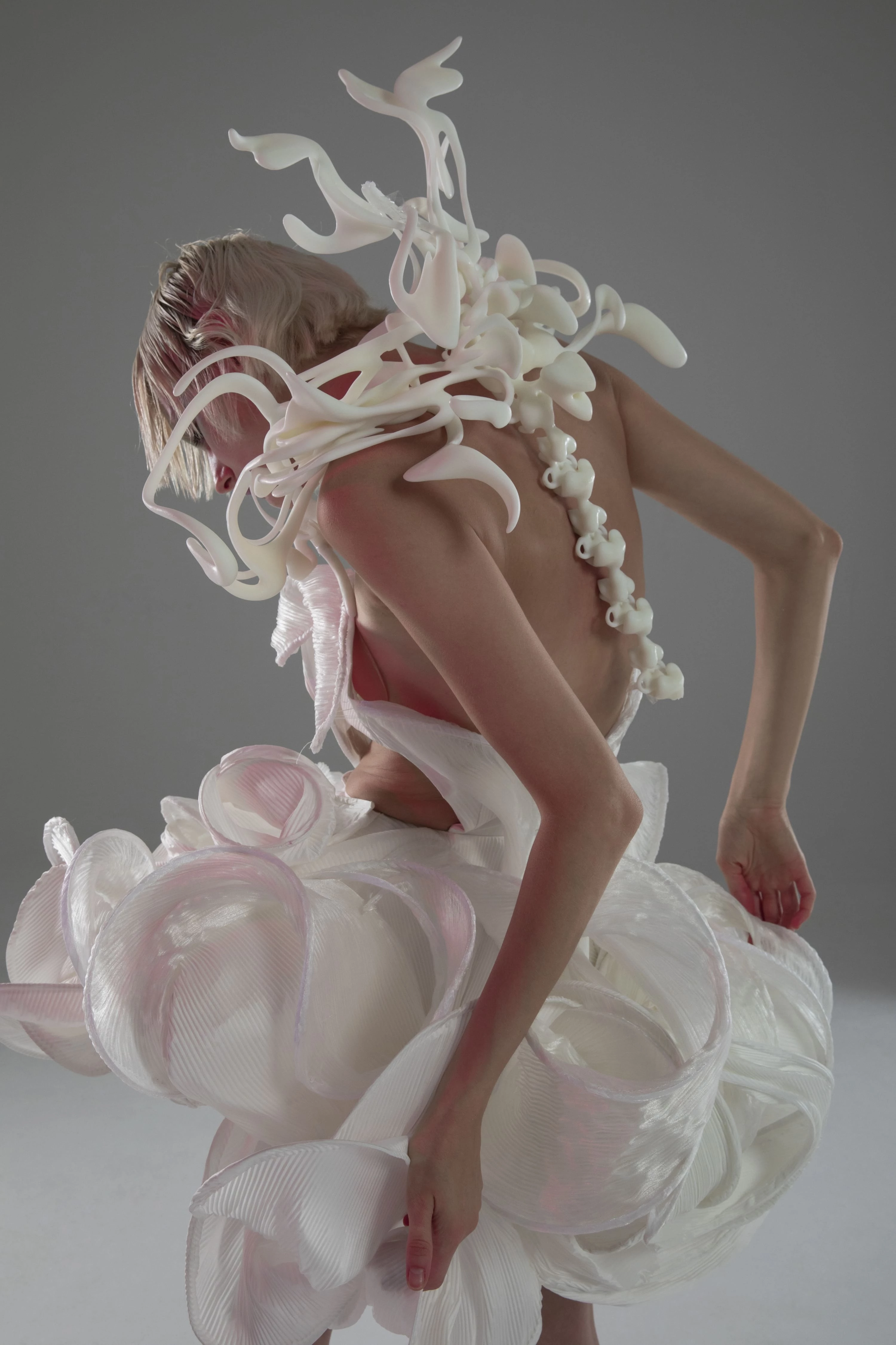 As an influential figure in the field, Fanrui draws inspiration from the enchanting and largely unexplored organic forms found in marine life. By amalgamating these fascinating physical inspirations with the unique characteristics of digital technology, such as algorithms and open methodology, she envisions clothing as a transformative force capable of redefining the notions of body and identity.