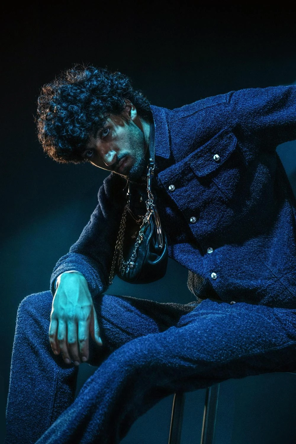 The pieces styled throughout the series, such as the blue bouclé denim jacket and jeans, reveal unexpected textures when captured mid-motion, while the black leather purse with charms introduces contrasting rigidity against the fluidity of the look. Tailoring in blue fil coupé—a jacket paired with matching trousers—responds dramatically to gesture, catching light through its intricate woven detailing. A check-motif shirt and tartan canvas shoes add a graphic counterpoint, grounding the movement studies in Westwood’s unmistakable ethos of pattern, craft, and subversive heritage.