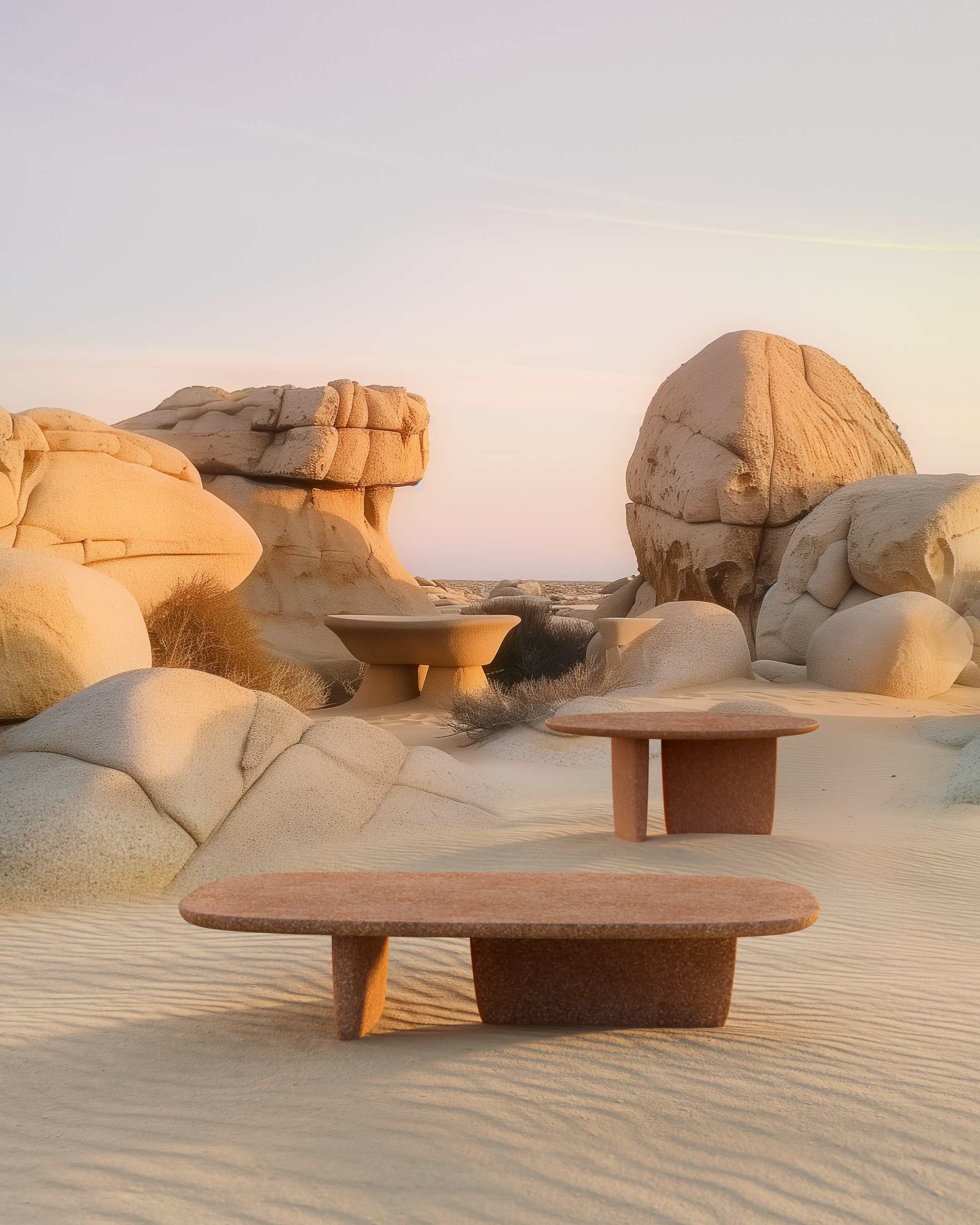 Using AI has allowed me to work faster by creating realism that might take much longer to create in a 3D program. It lets me focus more on composition, the overall concept, and the general artistic direction. It also allows me to insert a surreal idea I have and see how MidJourney will create variations based on that. For the Tobi-Ishi table scene, my concept was to reflect the shape of the table in different scales in the forms of rocks and landscape. MidJourney was able to quickly generate many different variations of this concept, allowing me to work on those that worked best.
