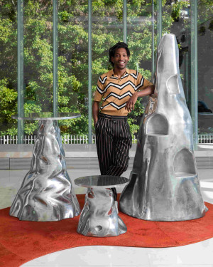 I have chosen to explore new technics to answer, at the same time, esthetical wills and ease of day life use (material weight). Thus, we sculpted foam and then burned it to give it its contrasted and textured surface. After that, we projected molten metal on it. About the carpet, we worked and cut leather to make it seem like earth and grass.