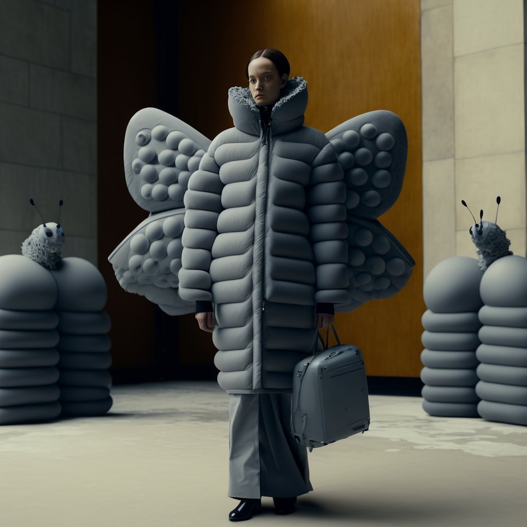 I think the most eye-catching and captivating images are the ones where a person (or weird biomimicry mutant) is occupying the center with an almost theatrical pose. The poses are dictated by biases in the software: If I use certain fashion keywords in the prompt, the AI remembers parts of databases which contain photoshoots with models or magazine covers where people are more likely to strike a certain pose. I am currently exploring the puffy clothes trend and realistic lighting that highlights the creases and folds of these fabrics. The puffer jackets and outdoor clothes in a non-outdoor environment combined with certain animalistic features gives it an interesting juxtaposition.