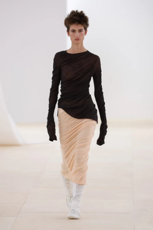 Soon, the haunting melodies of bird-like sounds, crafted by the performers, resonated as dancers moved in captivating contrast to the ethereal music. The first model made her appearance, cloaked from head to toe in a black pleat, emphasizing the contours of the body, as if the dress itself were an embrace, gently constraining her form. An ode to the spring-summer 1998 collection, where models elegantly walked in snug dresses with their hands sheltered within.