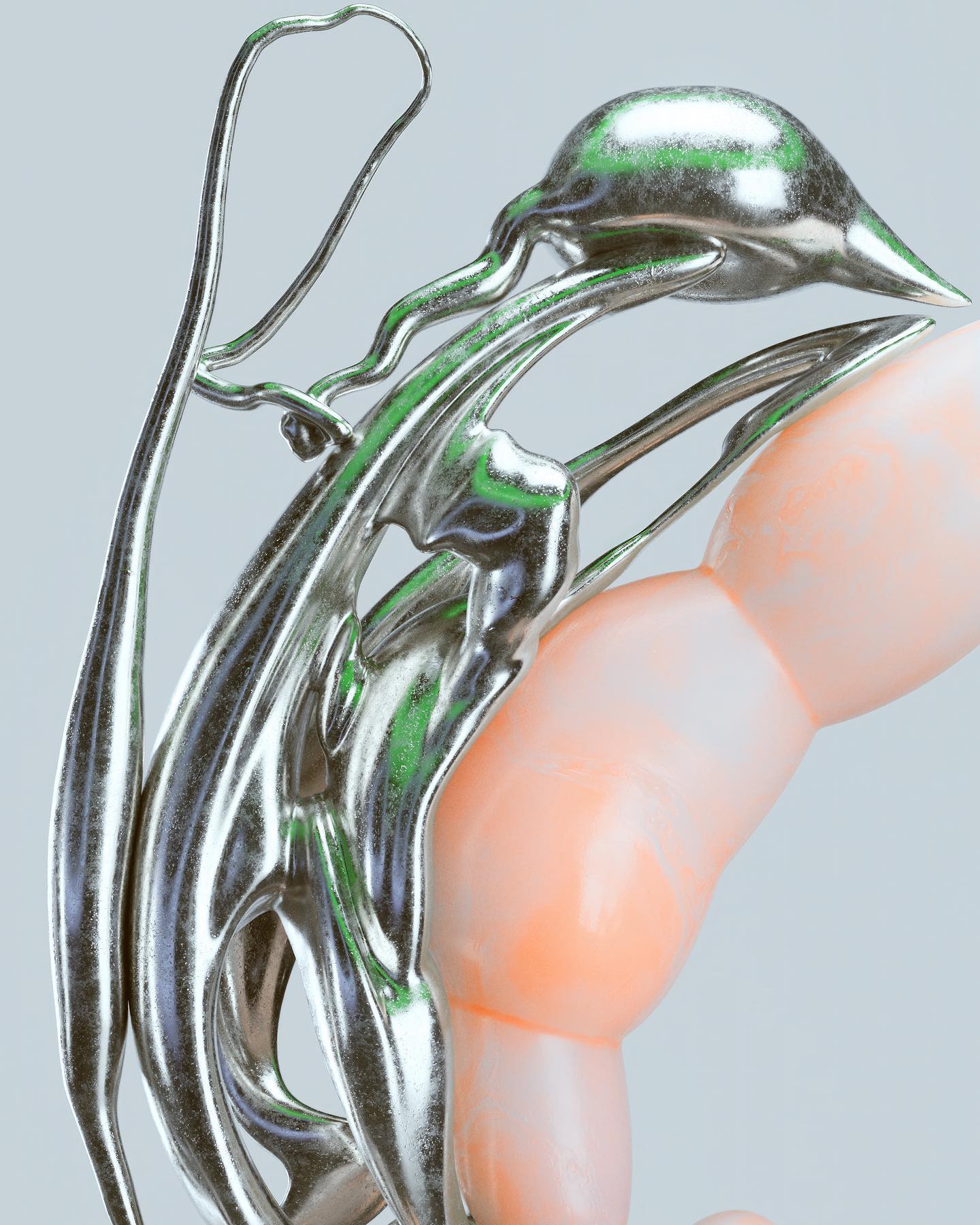 My inspiration comes from artists across different disciplines, including the visual universeof musicians likeARCA, Björk, Aphex Twin, and other figures in alternative music genres. The research of Neri Oxman andLucy McRae fascinates me, and I'm intrigued by their vision of the future. Additionally, the work of JonathanCastro and the experimentation with light and color by Olafur Eliasson and Carlos Cruz-Diez have all subtlyinfluenced my creations.Being part of the Hyperfuturism collective, I'm surrounded by artists with unique styles who envision thefuture of digital art authentically and personally, which has also been a significant influence.In my designs, I always strive to balance minimalism and chaos. I maintain the correct weight in composition,allowing the sculpture to breathe in a minimalist and clean space, which visually adds a poetic touch. Thecomplexity of the forms, combined with fractured details, is balanced with the harmony of color andcomposition. Even in seemingly monochromatic works, color is an essential element, where I use metal as atexture, and slight color detailsin reflections come to life.