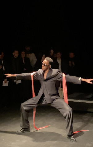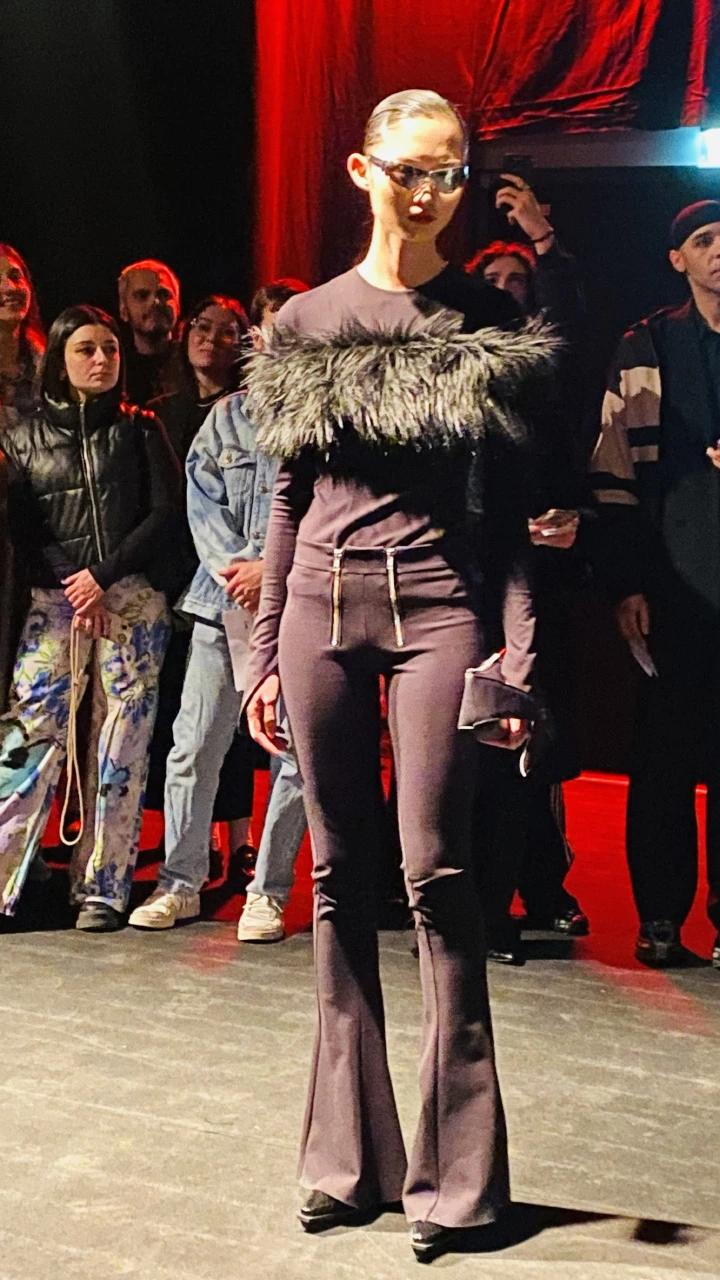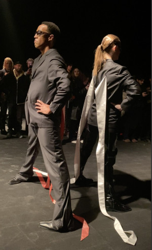 The collection is presented without a title and is referred to internally as 'untitled.' GmbH's focus on pure aesthetics creates a sense of freedom and leaves the meaning of the collection to the cut, fabrics, finishings, colors, and body. The formal exercise is presented with visceral live music by GmbH's long-time music collaborators, LABOUR, and City Ballet Corp's dancers' gesturing reminds us of a stripped-back fashion show from the past, reacting to the deafening noise that absorbs and assimilates everything and everyone.