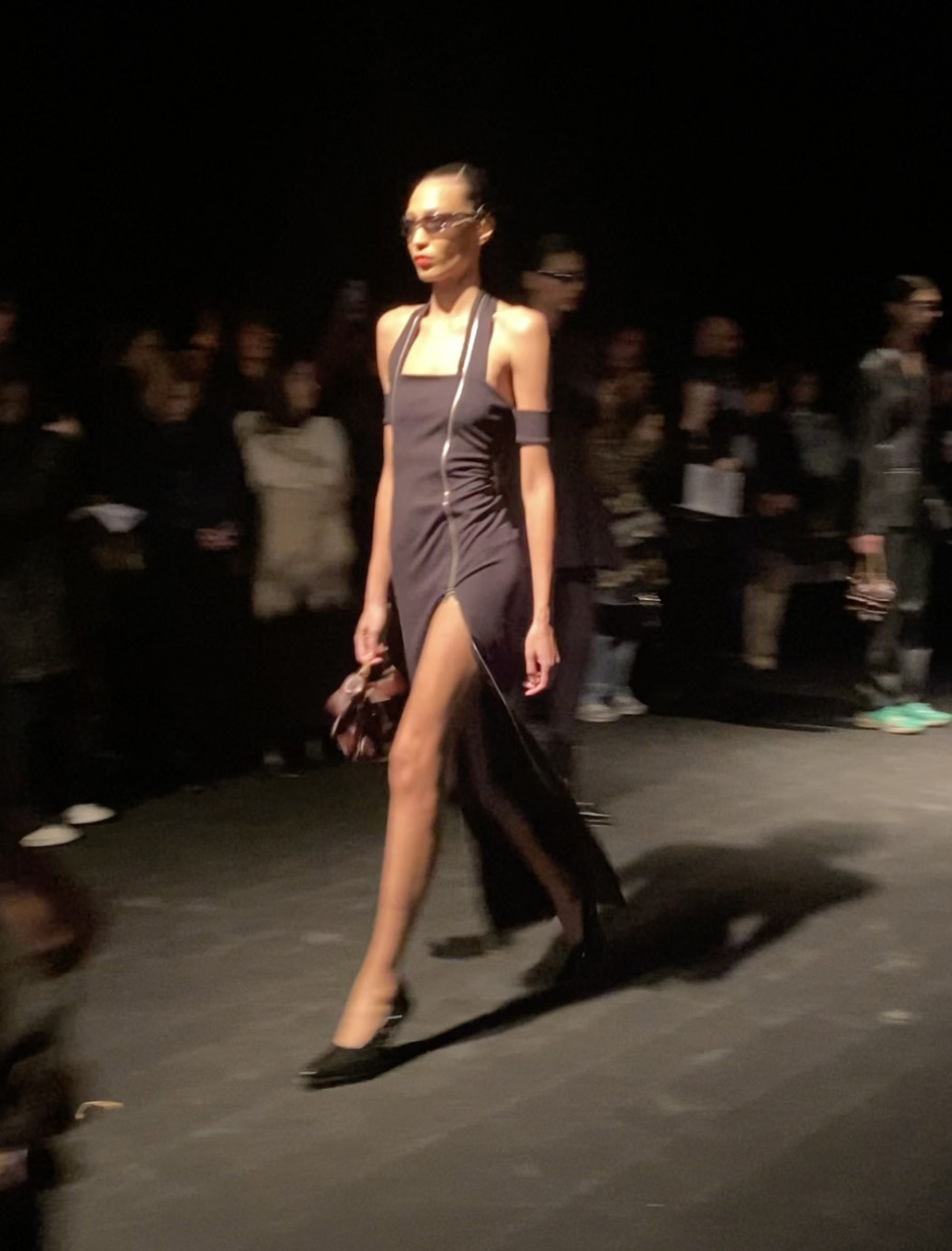 The collection includes boxy satin wool suits with contrasting satin stoles, dresses in jersey, sheer mesh, or velvet fitted with utilitarian zippers or fake fur, and an ankle boot with a middle zipper running to the front of the sole. Bows of all sizes decorate tailored coats and off-the-shoulder tops, while sharp and angular platform pumps and ankle boots are part of their first women's collection. The collection also features a new ASICS trainer collaboration, palladium silver earrings, and aerodynamic and utilitarian silver eyewear with mirrored lenses.