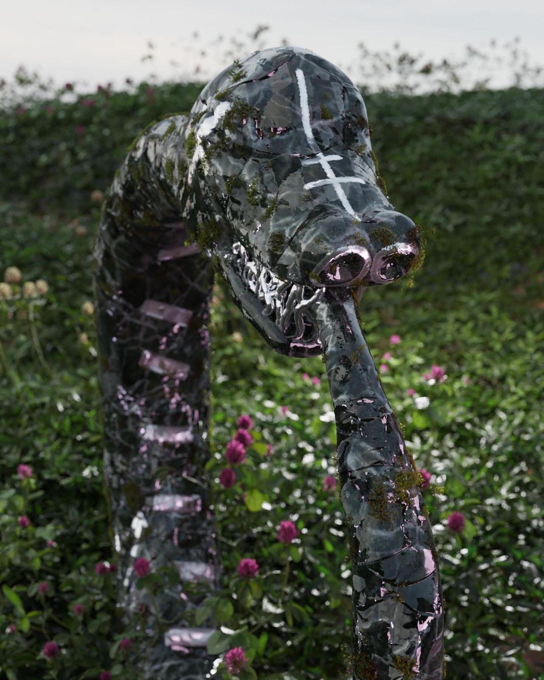 One of your series is called “cabinet de curiosité” and among the weird objects displayed there is a futuristic animal closely resembling ouroboros, the serpent or dragon eating its own tail. Supposing this is the actual reference, what is the connection between time (read eternity), technology and nature? It is surely telling that it is immersed in nature and standing (resting?) on grass; also nature is cracking through the glass-like fiber it is made of as the sprouts growing all over its body demonstrates.