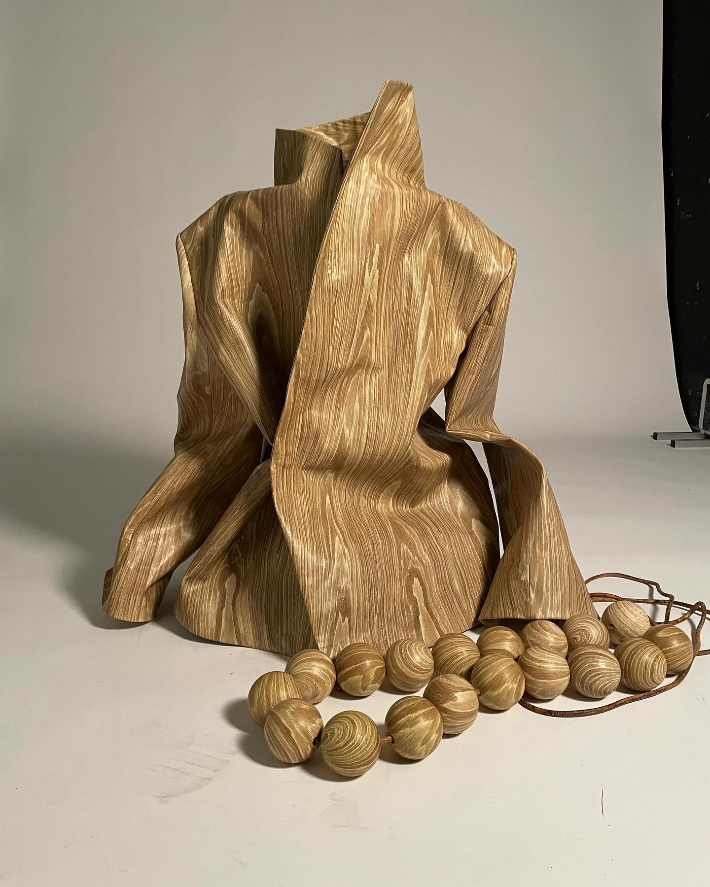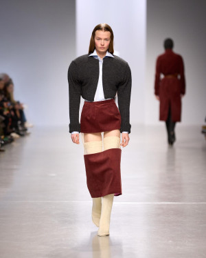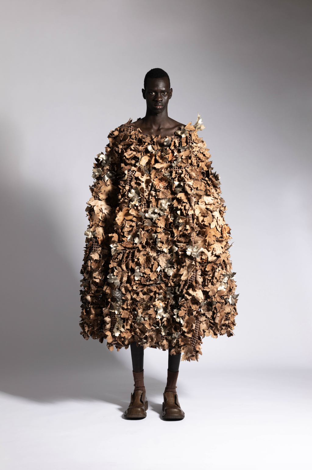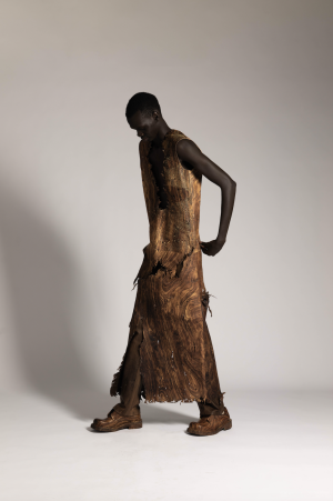 Qianhanliu studied womenswear at Central Saint Martins for her BA and has recently graduated from IFM with an MA in February. Her latest collection is about healing—a journey of understanding. It embodies a philosophy of peace, sobriety, and equality. A utopian lifestyle. A yearning for wellness. The collection draws parallels between two unreachable, overmarketed nirvanas of stereotypical Eastern oneness: the generous tailoring of one-piece cuts, easy jersey, and chunky knitwear of East Coast preppy style, and the drapery of natural textures from East Asian temple traditions. T-shirts and coats twist like knotted robes, recycled leather is printed and treated to resemble aged wood, and thousands of fallen leaves—each laser-cut from leather offcuts, singed, and stitched by hand—envelop an oversized sweater.