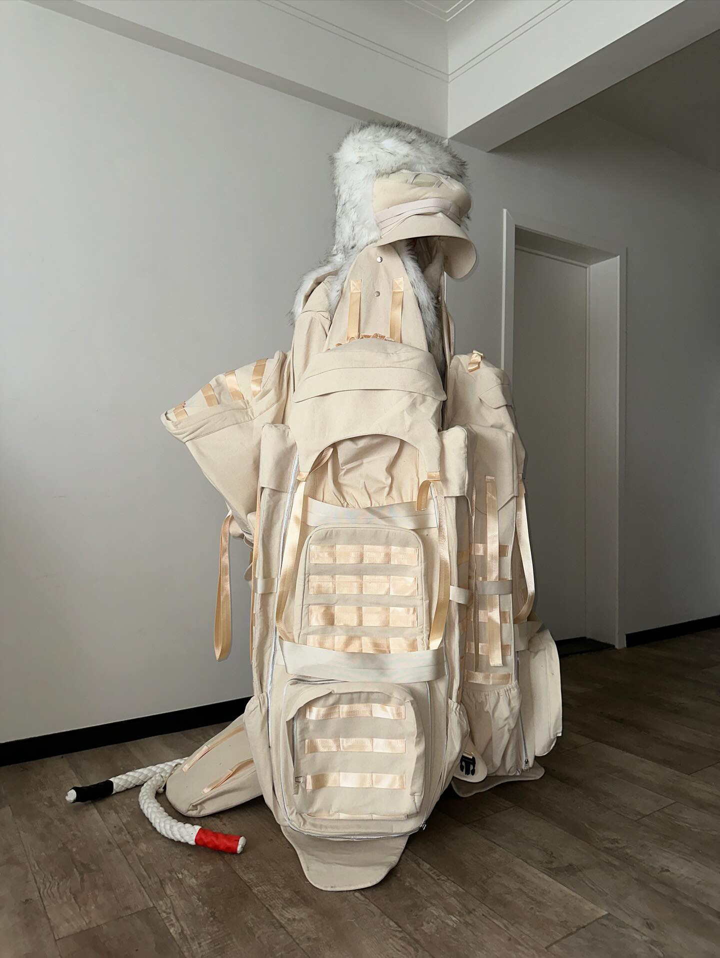 This experience inspired the artist to create an armored wedding dress, a powerful symbol of the devastation caused by war and a call for self-preservation. The dress represents the evolution of AoJiErOu's work with armor design, a recurring theme in his creations.