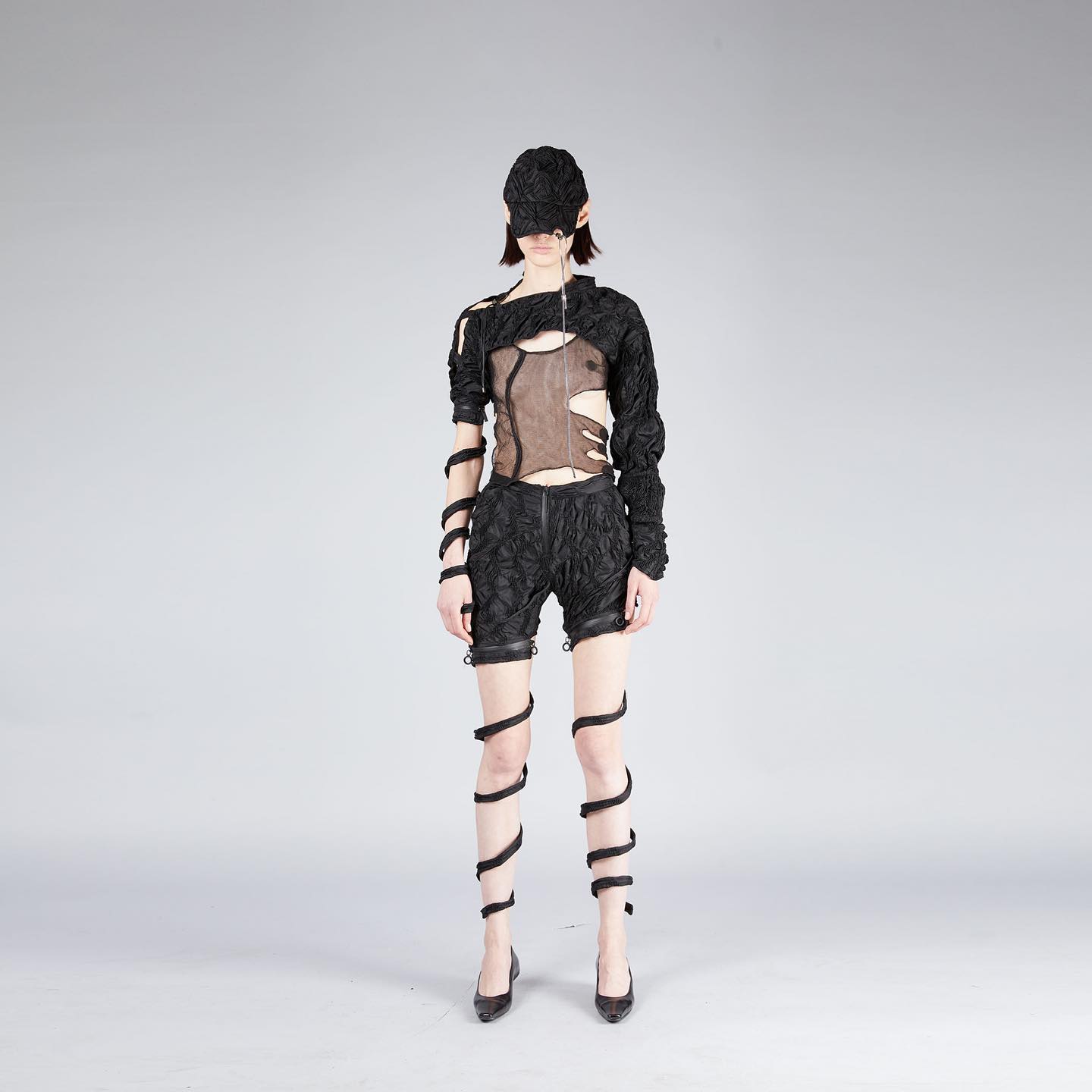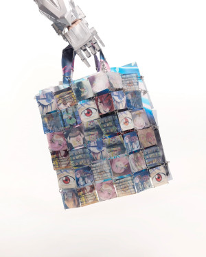Xijia’s latest collection was inspired by the first and largest platform for anime/manga-inspired fashion: @animefashion.archives, which she established in 2020. The collection has zero-waste knitwear garments made with upcycled yarns, accessories, footwear, and garments, using up-cycled materials, gallery posters, electronic trash, and broken anime figures from toy factories combined with 3d pattern-making and placement prints.