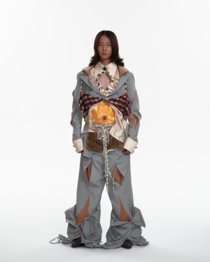 AoJiErOu, a student at the Royal Academy of Fine Arts Antwerp, uses fashion as a tool to challenge conventions and address complex social issues. His latest collection focuses on a chilling idea: the enduring influence of war on humanity.