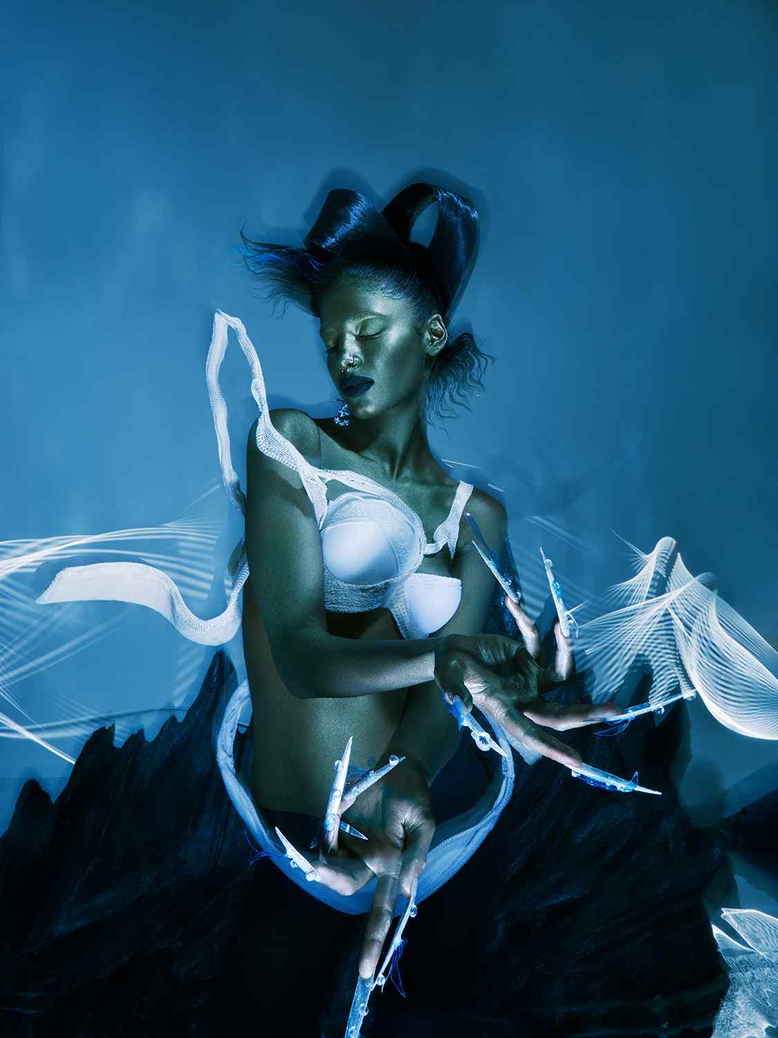 For "World 2.0," Eliška merged traditional photography techniques with digital enhancements, collaborating with 3D artists to create futuristic elements while incorporating in-camera light painting for a dynamic visual experience.